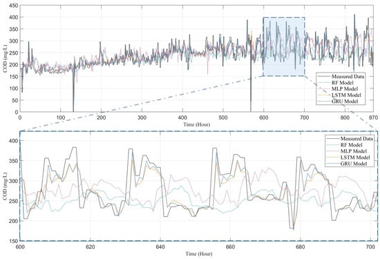 To thoroughly examine the performance of four models—RF, MLP, LSTM, and GRU—in predicting water quality, this study conducted a comparative analysis between the predicted outcomes for four water quality indicators (i.e., COD, NH3-N, TN, and TP) and their actual observational data, with the results presented in Figure 7, Figure 8, Figure 9 and Figure 10. Figure 7 presents both the actual observation data and the predicted outcomes for effluent COD. It is evident that the effluent COD concentration fluctuates around 200 mg/L, which can be attributed to the factory’s requirement to comply with the third-level standard set forth in the “Integrated Wastewater Discharge Standard” (GB8978-1996), stipulating that COD levels must not exceed 300 mg/L. Furthermore, a noticeable fluctuation in the effluent COD concentration occurred after 500 h of operation, which can be attributed to significant variations in the influent COD parameters. These fluctuations in the influent COD contributed to the overall instability of the effluent COD concentration in the wastewater treatment plant. Nevertheless, all models successfully captured the general trend of the COD fluctuations.