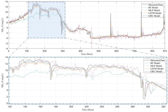 Comparison of NH3-N predicted by RF model, MLP model, LSTM model, and GRU model with measured data.