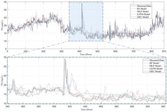 Comparison of TN predicted by RF model, MLP model, LSTM model, and GRU model with measured data.