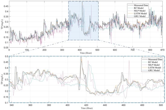 Comparison of TP predicted by RF model, MLP model, LSTM model, and GRU model with measured data.