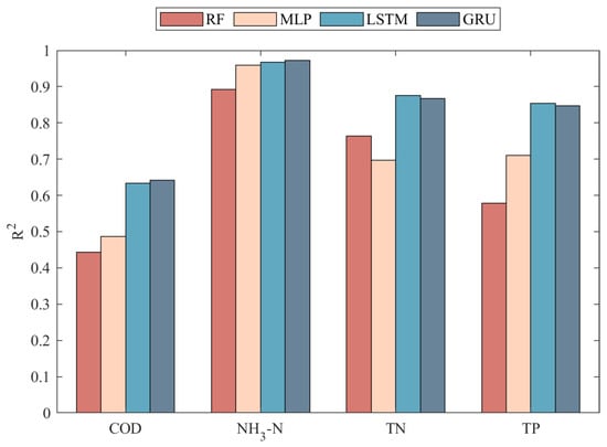 Figure 11 illustrates the predictive performance of different models across various water quality indicators. LSTM and GRU models demonstrate superior predictive capabilities compared to RF and MLP. Nevertheless, for COD, all models underperform relative to TP, TN, and NH3-N. Even advanced LSTM and GRU models only achieve an R2 of approximately 0.65, while RF and MLP yield R2 values between 0.4 and 0.5. This is due to the fact that COD, a comprehensive indicator of organic water pollution, is influenced by a variety of factors, including the source, composition, flow rate, and treatment processes of wastewater. These factors interact in complex ways, leading to the high complexity and nonlinearity of COD. In contrast, TP, TN, and NH3-N display relatively simple and linear variation patterns, making them easier for models to capture and resulting in higher predictive accuracy.