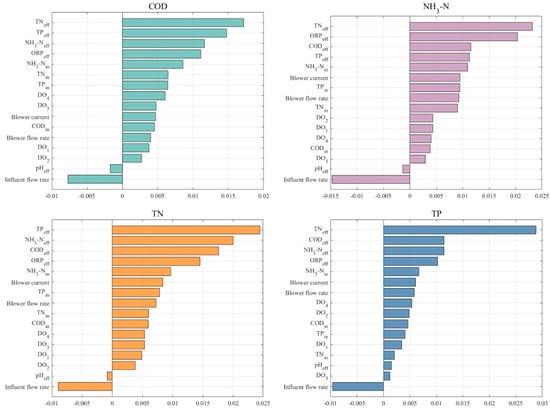 In order to explore in depth the relationship between the input model variables and the target output variables, the RReliefF analysis methodology described in Section 2.4 is employed in this study to evaluate the GRU prediction model used. The RReliefF values quantify the extent to which each input variable contributes to the target output, where higher values indicate that the variable contributes more significantly to the model output. Figure 12 illustrates the RReliefF values for each input variable, ranked in descending order, revealing the extent to which the four effluent indicators are influenced by multiple sources of data, including water quantity data, process variables, energy consumption data, and water quality data. Based on the RReliefF values, the study sets three further threshold intervals: −0.02 to 0, −0.02 to 0.005, and 0.005 to 0.03. These three intervals represent the removal of the variables that negatively affect the predicted targets, those that have less impact on the predicted targets, and those that have the greatest impact on the predicted variables, respectively.
