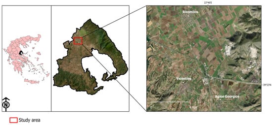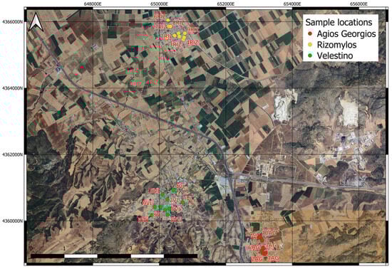 Volos is a coastal city in Thessaly Prefecture and the Magnesia Prefectural Unit (Central Greece), with a population of around 150,000 inhabitants. The whole area is characterized by a Mediterranean climate with hot, dry summers and cool, humid winters. The second industrial zone of the city is located 12–14 km west of Volos, where a steel plant is also situated. The research was carried out in three urban areas around the steel plant, named Agios Georgios (AG), Velestino (VL) and Rizomilos (RIZ) (Figure 1). These areas are within 6.5, 7.0 and 10 km from the steel industry, respectively.