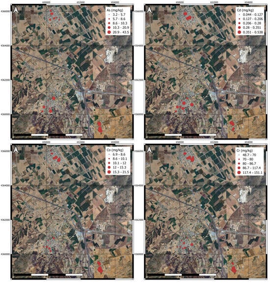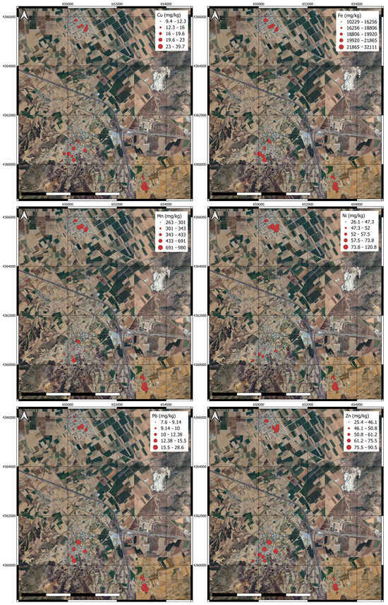 Geochemical maps of the studied PTEs in three urban areas.