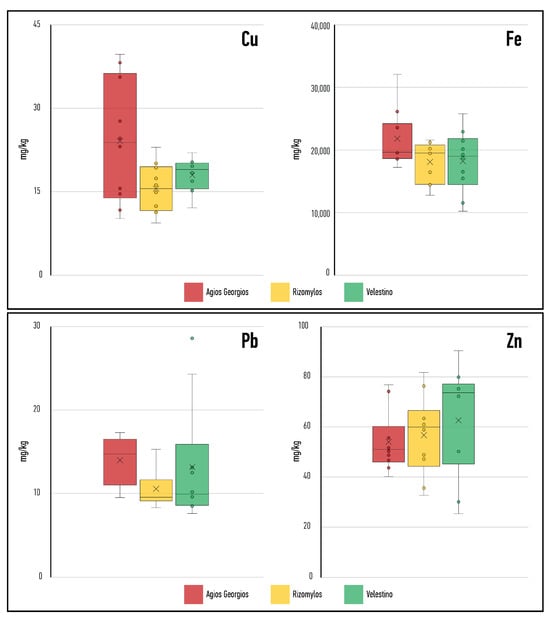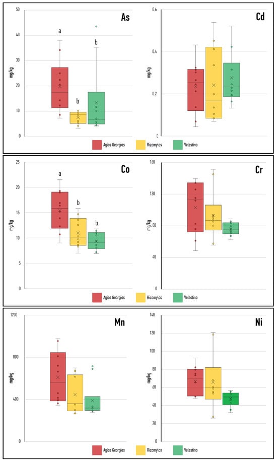A statistical comparison between the PTE concentrations in the three areas was also performed, and the results are shown in Figure 4. The comparison attempted to find differences in the degree of pollution between the three areas (each area was represented by its ten sampling sites) for each PTE measured here.