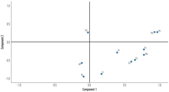 Grouping of PTEs through a PCA can reveal some interesting intercalations []. It looks as if most PTEs used in heavy industry activities (Mn, Fe, Cu, Co and Pb), as well as PTEs that manifest themselves in these environments (As, []) co-exist together (first component that explains 49.64% of the variance within the examined system). At the same time, additional variation is explained by a second component characterized by the absence (lower than average values) of Ni, Co and Cr in soils, which are also less alkaline than the average of the examined soils (average pH = 8.09). No causative explanation has been considered for low PTEs and lower pH here; it is known that mobility of most metals is higher in acidic soils [,]. As such, pollution is more dangerous at low pH; however, pseudo-total concentrations were measured here as no such data are available for the metal phase and speciation. It is possible that these soils are the least impacted by alloy production in the general urban vicinity of the industrial park. Finally, cluster analysis verified the presence of two clusters: one is characterized by higher anthropogenic impact in the form of higher values of Fe, Mn, Co and Cu, while the rest of the sites (21 in total) belong to the other cluster of lower ambient PTE concentrations, especially in the case of Fe, Mn, Co and Cu. As expected, the high-impact cluster contained most sites from AG, fewer from VL and the fewest from RIZ. A similar analysis based on PTE enrichment also distinguished sites according to their (vicinity to) various land uses [].
