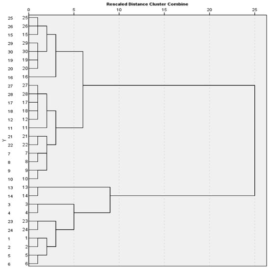 The PTE distribution within the 30 samples as well as the pH variation were subjected to a Principal Component Analysis (PCA) to describe the system with a new set of reduced variables []. Prior to performing the PCA, the suitability of the data for factor analysis was assessed. A hierarchical cluster analysis on the z-scores of the aforementioned parameters based on Ward’s method was performed. This was followed by a K-means Cluster Analysis that allocated all the examined cases into two clusters with different characteristics each []. All analyses were performed using SPSS 26.0 (IBM, Armonk, NY, USA).