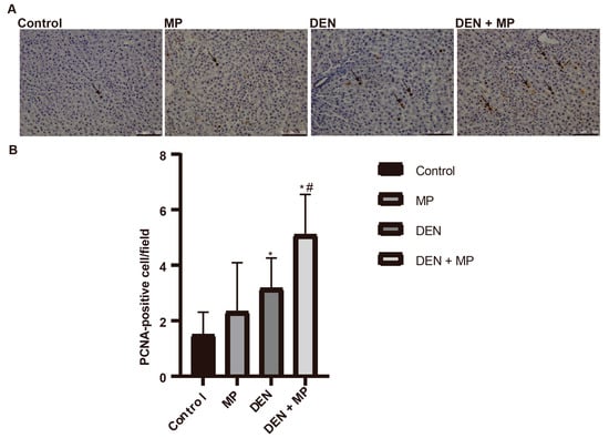 3.3. MP Enhanced Cellular Proliferation in the Livers of DEN-Induced Rats