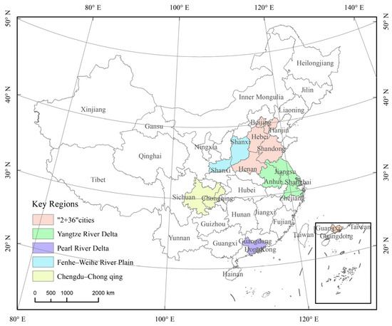 Mainland China is selected as the research area, and the key regions for air pollution prevention, as defined in the Action Plan for Continuously Improving Air Quality issued by the State Council in 2023, are selected as the key regions, including the Beijing–Tianjin–Hebei region and surrounding areas (“2 + 36” cities), the Yangtze River Delta (YRD) region, the Fenhe–Weihe River Plain region, the Pearl River Delta (PRD) region, and the Chengdu–Chongqing region. The study area and the five key regions are shown in Figure 1.