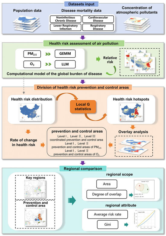 Different from traditional key regions for air pollution prevention and control, this study delineates health risk prevention and control areas from the perspective of reducing air pollution-related health risks, following a three-step approach. First, atmospheric pollutant concentration data, population statistics, and baseline mortality data for various diseases were utilized to estimate the health risks associated with PM2.5 and O₃, employing the GEMM and LLM, respectively. Next, spatial health risk hotspots were identified using the Local G statistic, and the HAs were delineated based on a spatial overlay analysis and rate of change in health risks. Finally, the KRs and HAs were compared in terms of their regional scope and attributes. The overall flowchart of this study is shown in Figure 2.