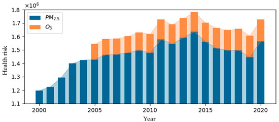 where refers to the number of health risks from disease x in age i and sex j exposed to a PM2.5 contaminated environment, where refers to i age group; j is the sex population of x; is the mortality rate of disease x in people with age i and sex j; refers to the number of population in age i, sex j; and is the relative risk of disease x in the i age group. The relative risk of PM2.5 is calculated by the GEMM [12], and the relative risk of O3 is calculated by an LLM [13]. To ensure clarity, central RR estimates were used, although the source models (GEMM and LLM) inherently incorporate uncertainty through confidence intervals. In this study, health risk specifically refers to the number of premature deaths attributable to air pollution [13,21].