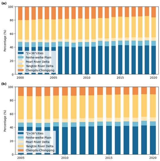 The statistical results of health risks attributed to PM2.5 in the five key regions from 2000 to 2020 are shown in Figure 4a. Health risks from PM2.5 consistently accounted for over 50% of the national total each year, with an average annual proportion of 52.64%. The trend initially increased before declining, with the highest risk recorded in 2014 at 860,600. The “2 + 36” cities had the highest proportion, averaging 41.10%, followed by the YRD region at 30.11%, the Chengdu–Chongqing region at 17.33%, the Fenhe–Weihe Plain at 7.22%, and the PRD region at 4.25%.
