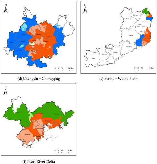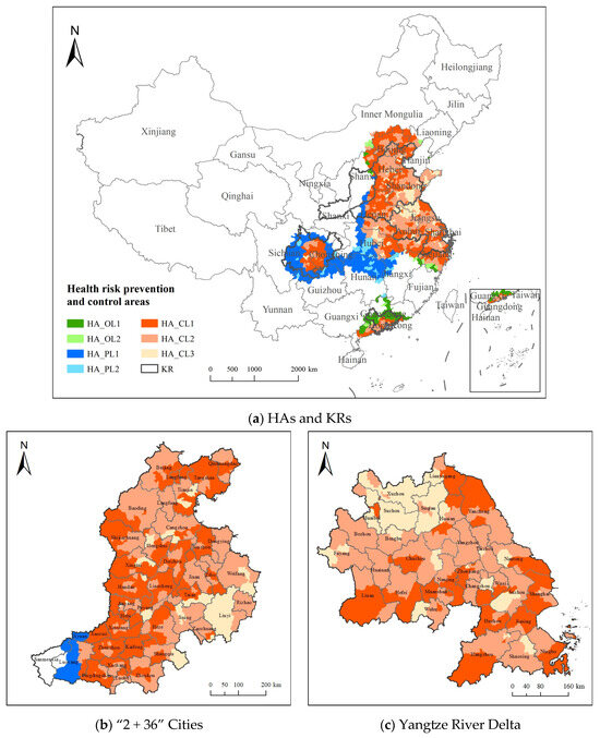 The spatial distribution of prevention and control types in the key regions is shown in Figure 5b–f. The YRD region is within the coordinated prevention and control area, with HA_CL1, HA_CL2, and HA_CL3 accounting for 32.31%, 51.97%, and 15.72%, respectively. Most of the “2 + 36” cities region also falls within the coordinated health risk prevention and control areas, with HA_CL1, HA_CL2, and HA_CL3 accounting for 43.28%, 44.74%, and 9.05%, respectively. The Chengdu–Chongqing region is mostly within the coordinated prevention and control area and HA_PL1. In the Fenhe–Weihe Plain, 86.52% is outside the health risk prevention and control areas, while the PRD region is mainly located within coordinated health risk prevention and control areas and HA_OL1.