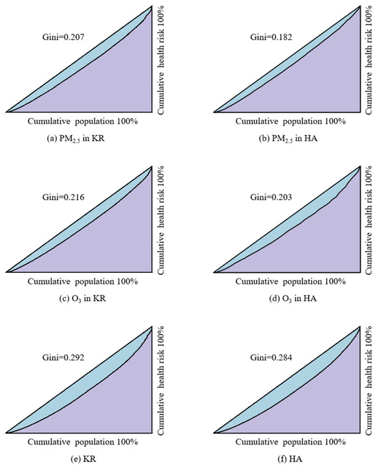 The health risk distribution of KRs and HAs was analyzed using the Lorenz curve and Gini coefficient. For HAs, HA_P was selected to calculate the Gini coefficient of health risk attributed to PM2.5, and HA_O was selected to calculate the Gini coefficient of health risk attributed to O3. The Gini coefficient for total health risk was calculated for collaborative prevention and control. The results showed that the Gini coefficient for health risk attributed to PM2.5 was 0.207 in KRs (Figure 6a) and 0.182 in HA_P (Figure 6b), for O3 it was 0.216 in KRs (Figure 6c) and 0.203 in HA_O (Figure 6d), and for total health risk, it was 0.292 in KRs (Figure 6e) and 0.284 in HAs (Figure 6f). The Gini coefficient for the corresponding health risk of pollutants in KRs is higher than that in HAs, indicating that the divided health risk prevention and control areas are more equitable and reasonable compared to the internal health risk distribution in KRs. Furthermore, the classification and control of HAs based on air pollutant types make regional air pollution control more targeted. Classified prevention and control contribute to more efficient regional joint efforts in air pollution control.