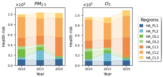 The quantitative comparison results of the attributes of health risk prevention and control areas and key regions are shown in Table 4. The table compares the health risk values of KRs and HAs during 2010, 2015, and 2020, as well as the average health risk attributed to PM2.5 in HA_P and KRs, and the average health risk attributed to O3 in HA_O and KRs. The results show that, regardless of whether the health risks are attributed to PM2.5 or O3, the health risks in HAs are higher than in KRs, with the average health risk of all parts of HAs generally being greater than that of KRs. This indicates that the delineated areas are more effective than KRs in the prevention and control of health risks.