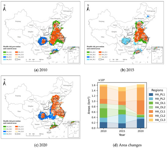 Seven types of health risk prevention and control areas are divided according to the division rules. The results of health risk prevention and control areas in 2020 are shown in Figure 5a, and the statistics of health risk prevention and control areas are shown in Table 2. The health risk prevention and control area is 1,628,600 km2; HA_CL1 has the largest area of 52.75 km2, and HA_OL2 has the lowest area of 2.57 km2. Health risk in HAs accounted for 65.62% of the national total health risk, among which the health risk of HA_CL2 was the highest, accounting for 37.17% of the health risk in HAs, and the health risk of HA_OL2 was the lowest, accounting for 0.81% of the health risk in HAs.