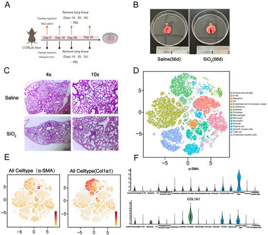Development of a murine silicosis model and elevated expression of col1a1 and α-SMA in silicosis mouse lungs. (A) Six- to eight-week-old C57BL/6 mice were intratracheally administered 50 μL of crystalline silica dust (SiO2, 50 mg/mL in saline, with particle sizes ranging from 0.5–10 μm) or a saline control via the oropharyngeal route on days 1 and 7. Lungs from three male and three female mice per experimental group were collected at days 14, 28, and 56 following the initial silica dust administration. (B) Representative images captured at day 56 post-silica challenge demonstrated morphological changes in the lungs. (C) Histological examination using HE staining revealed an increased presence of silicotic nodules in lung sections of silica-treated mice at day 56. (D) Single-cell transcriptomic sequencing classified lung tissue cells into 16 distinct subtypes. (E,F) Pulmonary fibrosis model success was confirmed through single-cell sequencing, revealing elevated expression levels of col1a1 and α-SMA. These markers were used to assess the extent of silica-induced fibrosis.