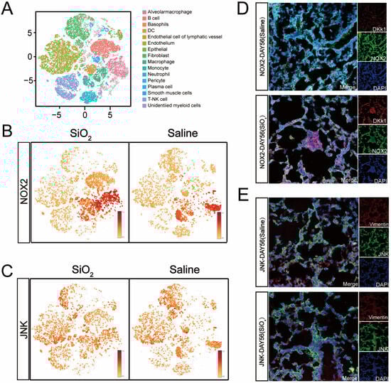 Depicts the elevated expression of NOX2 and JNK in the lungs of silicosis-afflicted mice induced by silica exposure at day 56. (A) The T-SNE plot, adapted from Figure 1D, showcases the expression patterns of the target markers NOX2 and JNK (B,C). These markers were analyzed across various lung cell subtypes in silica-induced silicosis mice at day 56 using single-cell sequencing, and their levels were compared to those of the saline-treated group (B,C). Immunofluorescence (IF) staining further verified the increased presence of NOX2 and JNK in the lung tissues at day 56 following initial exposure to silica dust (D,E). The scale bars in panels (D,E) measure 50 μm in both the first and second images.