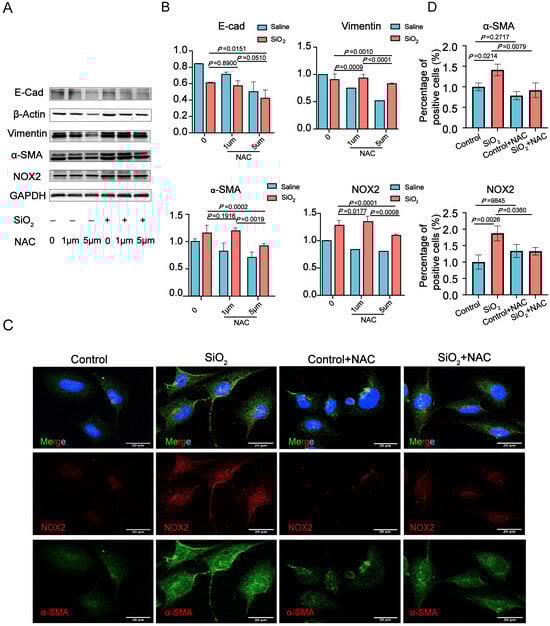 ROS scavenger N-Acetyl-L-cysteine (NAC) attenuates SiO2-induced NOX2 expression and EMT transition in human lung epithelial cells. BEAS-2B human bronchial epithelial cells were pre-incubated with varying concentrations of NAC (1–5 μM) for 1 h, followed by exposure to 100 μg/mL silica for 72 h.(A) Representative immunoblots revealed increased expression of NOX2 and EMT markers—E-cadherin (E-Cad), Vimentin, and α-SMA—in BEAS-2B cells treated with silica, as determined by immunoblotting assays. Notably, persistent NAC treatment (5 μM) significantly reduced silica-induced NOX2 and α-SMA expression in BEAS-2B cells compared to the silica-treated group. (C) Immunofluorescent analysis showed α-SMA (green) and NOX2 (red) in BEAS-2B cells exposed to saline or silica for 72 h, with or without NAC treatment (5 μM). Nuclei were labeled with DAPI (blue) to highlight the cellular structure in both untreated cells and cells exposed to 100 μg/mL SiO2 for 72 h. (B,D) Densitometric analysis was performed to quantify the relative protein levels in BEAS-2B cells treated with NAC and silica, as illustrated in panels (A,C). Data are presented as mean ± SD from three independent experiments, with comparisons made to both unstimulated controls and SiO2-treated controls. Representative staining images are displayed (n = 3), with a scale bar of 20 μm for all microscopy images.