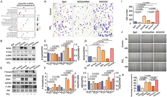 Effects of NOX2 on silica-induced EMT and JNK signaling in BEAS-2B Cells. BEAS-2B cells were infected with the specified adenoviral vectors at a multiplicity of infection (MOI) of 1000 for two hours, followed by exposure to silica and continued culture for 72 h. The expression levels of EMT marker molecules and phosphorylated JNK signaling were then evaluated. (A) The bubble chart highlights the involvement of the MAPK signaling pathway, which is closely associated with JNK activation. As a vital branch of the MAPK pathway, JNK plays a critical role in NOX2-mediated ROS production, driving silica-induced EMT and fibroblast activation in BEAS-2B cells. This underscores the importance of MAPK-JNK signaling in the pathological processes depicted. (B) Representative immunoblot images show the epithelial marker E-cadherin (E-cad), mesenchymal markers α-SMA, and NOX2 expression in BEAS-2B cells. Overexpression of NOX2 in BEAS-2B cells resulted in the upregulation of mesenchymal markers such as α-SMA and a reduction in the epithelial marker E-cad levels. In contrast, the shRNA-mediated knockdown of NOX2 produced the opposite effect. The experiments were performed in three biological replicates. (C,D) Quantitative analysis of the indicated protein expression in panel (B) was performed using densitometric analysis of immunoblots. (E) Representative immunoblots show phosphorylated JNK (Phos-JNK) signaling in BEAS-2B cells. Overexpression of NOX2 in BEAS-2B cells resulted in increased Phos-JNK expression, whereas shRNA-mediated NOX2 knockdown yielded the opposite effect. (F,G) The relative abundance of the indicated proteins in panel (E) was quantified via densitometric analysis of immunoblots across three independent experiments (n = 3). Representative invasion images of the above cells were assessed using the Transwell assay in BEAS-2B cells. Overexpression of NOX2 resulted in reduced cell migration ability and an increased cell count, while shRNA-mediated knockdown of NOX2 produced the opposite effect. Migration capacity was further evaluated using the cell scratch assay in BEAS-2B cells. (H,I) Transwell migration assay results for the control and silica-exposed (SiO2) groups treated with BGIII, NOX2 shRNA, and NOX2 overexpression (OE) are shown. The figure displays representative stained images and quantification of cell migration in Transwell assays (n = 3). (J,K) Quantification of wound gap closure in the wound healing assay is presented. The vertical yellow lines in the figure were used to mark the scratch wound healing process as an initial assessment of cell migration ability. The first row of the control and SiO2 groups represents the starting time (0 h), and the second row shows the wound changes at 48 h. In the NOX2 overexpression group, the wound appears significantly narrower at 48 h, indicating that NOX2 induction enhances the migration ability of BEAS-2B cells. The data are expressed as mean ± SD and are derived from three independent biological experiments conducted in triplicate (n = 3).