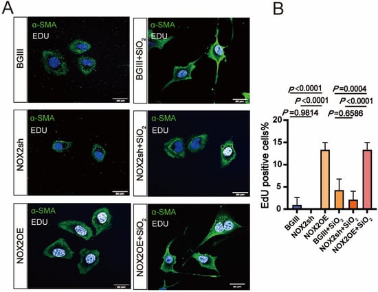 Inhibition of NOX2 leads to reduced proliferation of BEAS-2B cells. (A) Representative immunofluorescence images demonstrate α-SMA (green) expression and EdU (white) labeling in BEAS-2B cells treated with SiO2 for 72 h. Cells were infected with sh-NOX2 or OE-NOX2 constructs, and their performance was compared with those infected with the AdBglII control. Proliferative activity was assessed by quantifying the number of EdU-positive cells. The results indicate that overexpression of NOX2 enhances α-SMA expression and proliferative capacity in BEAS-2B cells, while shRNA-mediated suppression of NOX2 diminishes both α-SMA expression and proliferative capacity, regardless of SiO2 exposure. Expression levels were further quantified (B). The data are presented as mean ± SD across three independent biological experiments, each conducted in triplicate (n = 3).