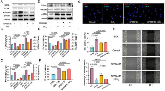 NOX2 activates EMT transition via JNK/c-Jun signaling to promote epithelial cell proliferation, migration, and invasion. JNK inhibitor SP600125 reverses SiO2-induced proliferation, migration, and invasive capacity in human epithelial cells. BEAS-2B cells were pretreated with 20 μM SP600125 for 2 h, followed by exposure to SiO2 and subsequent culture for 72 h. Epithelial-to-mesenchymal transition (EMT) and cell proliferation were analyzed using immunoblotting and immunofluorescence staining. (A) Representative immunoblots demonstrate activation of the JNK signaling pathway in SiO2-exposed BEAS-2B cells, while SP600125 markedly inhibits JNK signaling activation. This effect is evidenced by decreased expression of key pathway components, including p-JNK and p-c-Jun. Additionally, the TGF-β/Smad signaling component p-Smad3 shows reduced levels in BEAS-2B cells pretreated with SP600125 compared to those treated solely with SiO2. (B,C) Quantitative densitometric analysis of the immunoblot results in (A) indicates the relative abundance of specified proteins. (D) BEAS-2B cells pretreated with SP600125 displayed a reduction in the abundance of mesenchymal markers, such as Vimentin and SMA, alongside increased expression of the epithelial marker E-cadherin (E-Cad), as demonstrated by Western blot analysis. (E,F) Quantitative densitometric analysis of protein expression in (D) further corroborates these findings. (G,I) Immunofluorescence staining for the proliferation marker Ki67 (red) illustrates diminished proliferative capacity in SP600125-pretreated BEAS-2B cells compared to SiO2-treated cells. Quantification of Ki67-positive cells supports a significant reduction in proliferation. (H) The migratory capacity of BEAS-2B cells was assessed via a cell scratch assay. Representative images demonstrate reduced cell migration in SP600125-pretreated cells compared to SiO2 controls. (J) Quantification of the wound closure in the cell scratch assay confirms attenuated migratory behavior in the SP600125-treated group. Data are presented as the mean ± SD of three independent biological experiments, each performed in triplicate (n = 3).