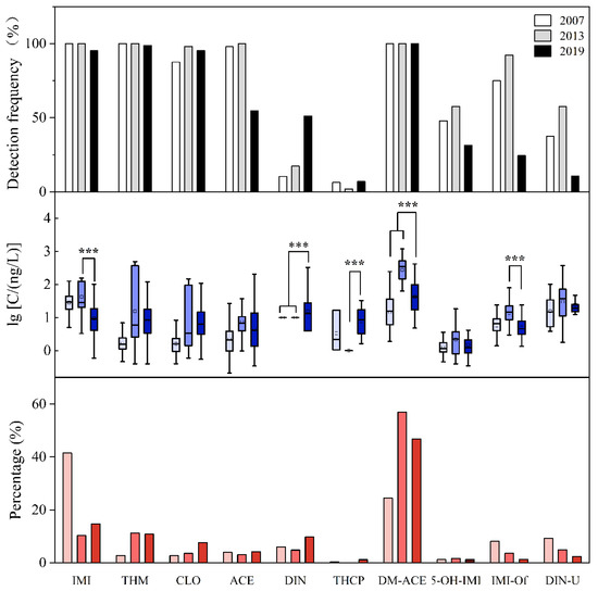 Obvious temporal variations were observed during the sampling periods from 2007 to 2019. The highest ΣNEOs and IMIeq were found in a colostrum sample collected in 2013, and these levels declined significantly from 2013 to 2019 (Mann–Whitney U test, p < 0.001). The median ∑NEOs in 2013 (589 ng/L) was nearly five times higher than that in 2019 (100 ng/L) (Table S4). Colostrum concentrations of DM-ACE also decreased from 346 ng/L in 2013 to 42.6 ng/L in 2019 (Figure 2). Although the Σp-NEOs in 2019 was comparable to those in 2013 (44.3 ng/L vs. 49.3 ng/L), parent compounds exhibited notable yet distinct variations from 2007−2013 to 2019. DIN concentrations significantly increased (Kruskal–Wallis H test, p < 0.001), along with an increase in detection frequencies (from 10.4%−17.3% to 51.2%) and a consistent level of concentration percentages (4.8−6.0% in 2007−2013 vs. 9.8% in 2019). Conversely, IMI concentrations decreased from the elevated levels observed in 2013 to those in 2019 (Mann–Whitney U test, p < 0.001), yet they maintained similar concentration percentages over this period (10.3% in 2013 compared to 14.6% in 2019) (Figure 2).