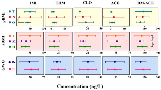 Obvious group differences in the colostrum concentrations of individual NEOs were frequently observed in 2019 (Figure 3). Although these concentration differences were often not statistically significant, mothers with normal pBMI exhibited higher colostrum levels of IMI or THM, compared to the obese group. And mothers who gained the recommended weight during pregnancy had low colostrum levels of IMI or THM (Figure 3). Additionally, mothers in the low aBMI group generally displayed relative high colostrum concentrations, while comparable concentrations were often found between the medium and high aBMI groups. Similar phenomena were also observed in 2013 (Table S5). Overall, GWG and BMI may affect colostrum concentrations, which are often associated with maternal dietary habits before and during pregnancy.