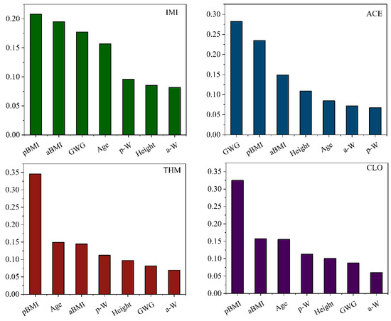 Random Forest simulations were conducted to rank influential factors using combined data from 2013 and 2019. The testing results were favorable for p-NEOs with high detection frequencies (>75%) with the training R-value exceeding 0.84. Generally, aBMI and pBMI were among the top three important variables influencing the concentrations of IMI, THM, CLO, and ACE. For example, pBMI was the primary influence factor on IMI, followed by aBMI and GWG. while pBMI, and aBMI were the first and third important variables for THM (Figure 4). The influence of BMI on the concentrations of most p-NEOs also suggested a possible relation with maternal dietary habits.