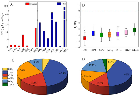 Estimated daily intake of neonates in the first week of life through breastfeeding (A), hazard quotient (B), percentage contributions to the overall health risk under medium exposure scenarios (C), and under high-exposure scenarios (D). IMIT: including IMI, 5-OH-IMI, and IMI-of; ACET: including ACE and DM-ACE; DINT: including DIN and DIN-U. Boxes in (B) represent interquartile ranges; the square and central line within each box denote the median and mean levels, respectively; upper and lower whiskers indicate the 95th and 5th percentiles, respectively.