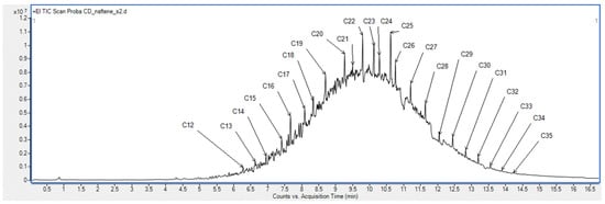 Following the experimental determinations carried out, the acidity value of the NAs fraction was AV = 258.1 mg KOH/g. For this sample, the content of unsaponifiables was determined, with the value obtained being 19.78% wgt. The chromatogram of the NAs sample is shown in Figure 1.