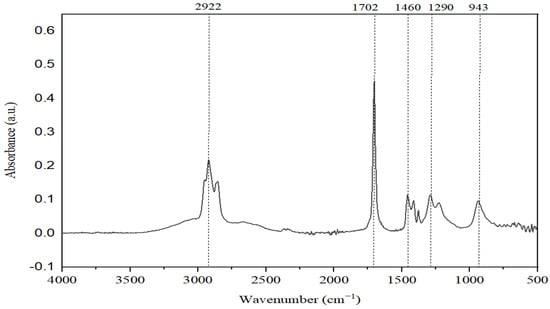 To address the GC-MS limitation, we turned to FTIR analysis for further insight into the classes of chemical compounds present—specifically, naphthenic acids or hydrocarbons analytically identified as unsaponifiable. The NAs sample used in our experiments was characterized by FTIR spectroscopy, in the region of 4000–400 cm−1. FTIR spectra have distinct bands, and were assigned a range of vibrationally active chemical groups (Figure 2) [31,32].