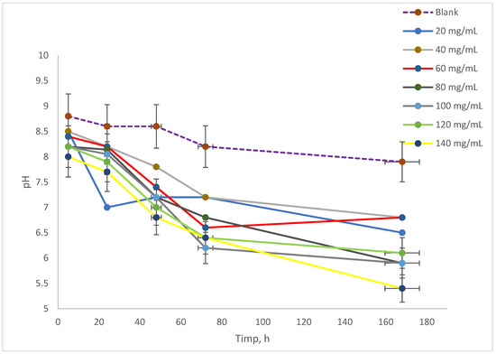 The evolution of pH in the culture medium exposed to varying concentrations of NAs is illustrated in Figure 3. Initially, the pH values of the samples before incubation ranged from 9.5 to 10.0. After 5 h of analysis for series A, it was observed that the pH of the samples contacted with naphthenic acids fell within the range of 8.0 to 8.5, while the blank sample’s pH decreased to 8.8. In terms of the blank sample’s pH progression, it remained stable at 8.6 for up to 48 h, after which it dropped slightly to 8.5 at 72 h, eventually reaching 8.33 by 168 h. The samples that interacted with NAs exhibited a similar pH evolution, with values between 8.0 and 8.5 after 5 h of incubation [15,33]. Over the course of the experiment, the pH continued to decline, ultimately falling within the range of 6.0 to 7.0 by 72 h. By the conclusion of the experiment, all samples displayed lower pH values, reaching a range of 5.5 and below.