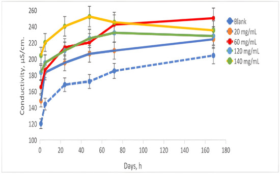 The conductivity (Figure 4) of the analyzed samples during the experiment exhibited an initial value ranging from 140 to 200 µS/cm for the samples that were in contact with AN, while the control sample began at 100 µS/cm. Over the course of 72 h, the conductivity values increased; the control sample reached 170 µS/cm, and the contacted samples ranged from 170 to 250 µS/cm. By the conclusion of the experiment, after 168 h, the control sample recorded a conductivity of 190 µS/cm, while the contacted samples remained in the range of 210 to 240 µS/cm.
