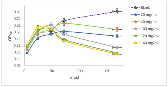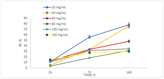 The percentage of growth rate in presence of NAs, quantified as the inhibition ratio (IR) is illustrated in Figure 9, demonstrating that after 24 h, the reduction was approximately 13% for the 20 mg/mL sample. After 168 h, the reduction values for the 60 mg/mL and 100 mg/mL samples reached 85%. In terms of inhibition, the percentages were between 5% and 10% after 24 h, increasing to between 25% and 30% after 168 h. For the highest AV concentration tested, 140 mg/mL, the inhibition was 5% after 24 h and 20% after 168 h.