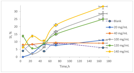 The two measurements allowed for the quantification of the sedimentation index (SI), which is graphically represented in Figure 6. It was observed that the highest SI, approximately 40%, occurred in the sample exposed to 140 mg/mL AN after 168 h of stirring. The control sample exhibited an IS that varied, ultimately reaching around 5% by the end of the experiment. In contrast, the sample treated with 40 mg/mL showed an SI of approximately 6% at the conclusion of the experiment, indicating that this concentration has a minimal impact on cell development and that the chemical stress induced by NAs is manageable.