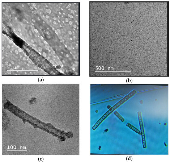 Figure 7. Record of a Spirulina platensis from a TEM: surface structure in blank culture algal growth (a); strain culture with NAs (140 mg/mL) after 48 h contact (b); strain culture with NAs (20 mg/mL) after 168 h contact (c); and optical microscopy of blank culture after 24 h, 1200× (d).