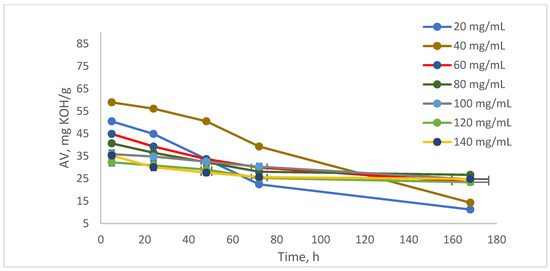 The analysis of the acidity value (AV) demonstrates that the amount of naphthenic acid (NAs) can be reduced through biological treatment using Spirulina platensis (Figure 8). After 5 h of treatment, the acidity value (AV) values ranged from 35 to 85 mg KOH/g of sample. After 72 h, the AV decreased to between 25 and 60 mg KOH/g. Finally, at the end of the test, after 168 h, the AV were recorded at 15 to 35 mg KOH/g of sample [34,35,36].