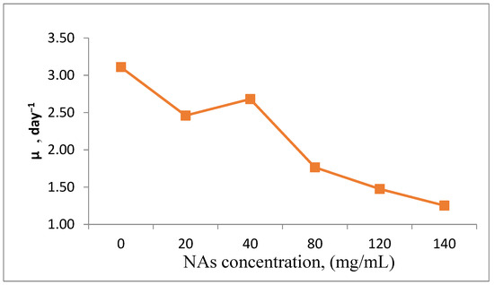 From Figure 11, it can be seen that the blank sample had μ = 2.35, day−1 compared to the samples contacted with Nas, which had μ 2.50, day−1 (the 20 mg/mL sample). During the same time, the 40 mg/mL sample had a higher growth rate, μ 2.75 day−1, which means that NAs in this concentration were not inhibitors, but were used as a food source, as a nutritional support for the synthesis of cellular material. A higher concentration of NAs resulted in a lower μ value, between μ 2 and 1.25 day−1 for the maximum amount of NAs tested, 140 mg/mL.