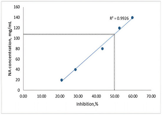 The inhibition ratio (IR) was analyzed by the enumeration of cell numbers every 5 h, 24 h, 48 h, 72 h, and 168 h under an optical microscope (×400). Equation (3) was utilized to determine the percentage of cell growth inhibition (% IR) at every concentration of NA under examination [23,24,25].
