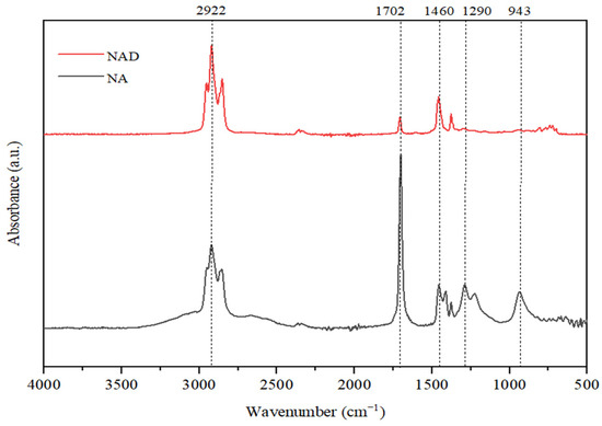 The spectrum analysis reveals that absorption bands at 2922 cm−1 can be observed, indicating the presence of valence vibrations of C-H bonds found in alkanes. This peak is more intense for the NAD sample, indicating an increase in the concentration of carbon in paraffinic structures as a result of the degradative processes suffered by naphthenic acids.