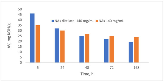 The acid value of NAs distillate (140 mg/mL) was initially higher than that of NAs (initial naphthenic acids (140 mg/mL)), but decreased after a steeper slope than that of NAs. This behavior is due to the higher biodegradation rate of NAD than NA. Therefore, increasing the molar mass of NAs decreases the biodegradation rate of NAs.