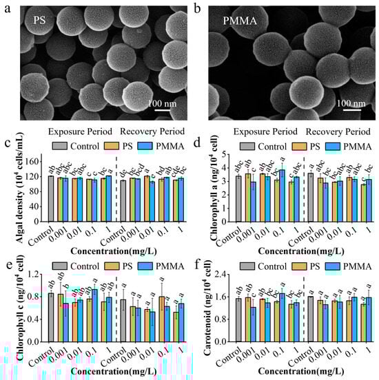 Characterization of MPs and algal growth. SEM images of (a) PS and (b) PMMA. (c) Density of algae. (d) Chl a content. (e) Chl c content. (f) Carotenoid content. Both exposure and recovery experiments were conducted for 96 h. The different lowercase letters in the figure denotes significant differences, p < 0.05.