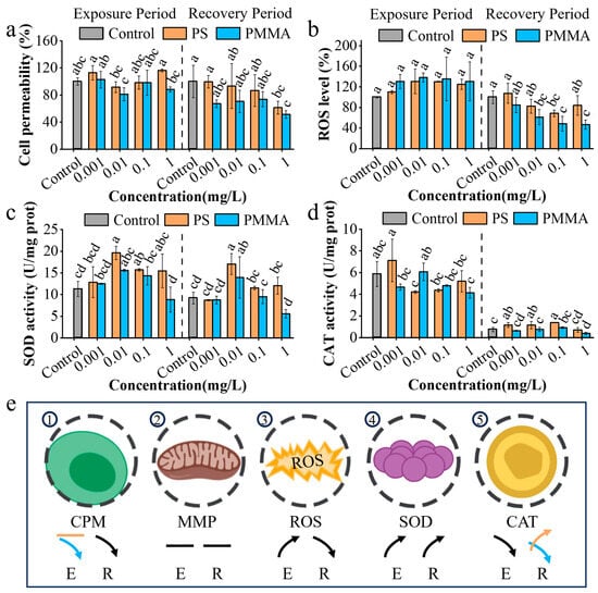 Cellular oxidative stress responses to MPs. (a) Relative cell permeability. (b) Relative ROS level. (c) SOD activity. (d) CAT activity. (e) Illustration of oxidative stress responses of algae after exposure and recovery. E, exposure period; R, recovery period. The orange arrows represent PS, the blue arrows represent PMMA, and the black arrows represent both PS and PMMA. The upward- and downward-facing arrows indicate upregulation and downregulation, respectively, and the horizontal bars indicate no significant change. The different lowercase letters in the figure denote significant differences, p < 0.05.