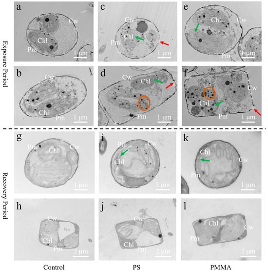 The SEM image showed that the microalgal cell size was approximately 3–5 μm and had a porous surface structure (Figure S5). TEM images showed that the cell walls, plasma membranes, chloroplasts, and other cytoplasmic compartments were clearly visible in control groups (Figure 3a,b). PS and PMMA exposure could damage the ultrastructure of microalgae, such as the damage to cell walls (red arrows) and chloroplast integrity (green arrows) in Figure 3c–f. Compared to the control, PS and PMMA increased cell wall damage by 25.56% and 20%, respectively (Figure S6). Similar cell wall damage was also observed in freshwater algae exposed to PS nanoplastics (NPs) in a previous study []. The chloroplast blurring caused by PS and PMMA was increased by 14.24% and 12.28%, respectively (Figure S6), which was consistent with the decrease in Chl a in Figure 1. In addition, a higher number of starch grains was observed in microalgal cells after PS and PMMA exposure compared to the control (orange circles) in Figure 3d–f. A similar phenomenon has been found in freshwater and marine microalgae exposed to PS MPs and graphene oxide in previous studies [,]. The increased number of starch grains in microalgal cells is considered a defense mechanism to resist and reduce the damage of MPs []. After recovery, the microalgal cell walls in PS and PMMA groups were clear and intact, similar to that of the control (Figure 3g–l). However, the chloroplast blurring in PS and PMMA groups (green arrows in Figure 3i,k) was still increased by 13.19% and 11.89%, respectively (Figure S6), indicating that the chloroplast damage was difficult to recover, consistent with the decrease in Chl a after recovery in Figure 1. Sustained chloroplast damage potentially affected photosynthetic activity, thereby reducing the primary productivity of diatoms [].
