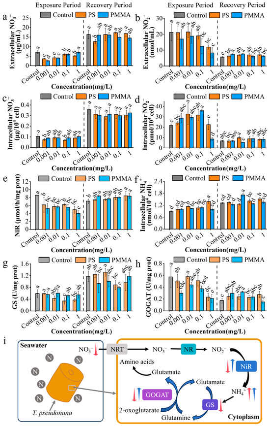 Effects of MPs on nitrate utilization in T. pseudonana. (a,b) Extracellular nitrate and nitrite contents. (c,d) Intracellular nitrate and nitrite contents. (e) NiR activity. (f) Intracellular ammonium content. (g,h) GS and GOGAT activities. (i) Schematic plot of nitrate utilization affected by MPs after exposure and recovery. NRT, nitrate transporters. The red and blue arrows indicate the exposure and recovery periods, respectively. The upward- and downward-facing arrows indicate upregulation and downregulation, respectively. The different lowercase letters in the figure denotes significant differences, p < 0.05.