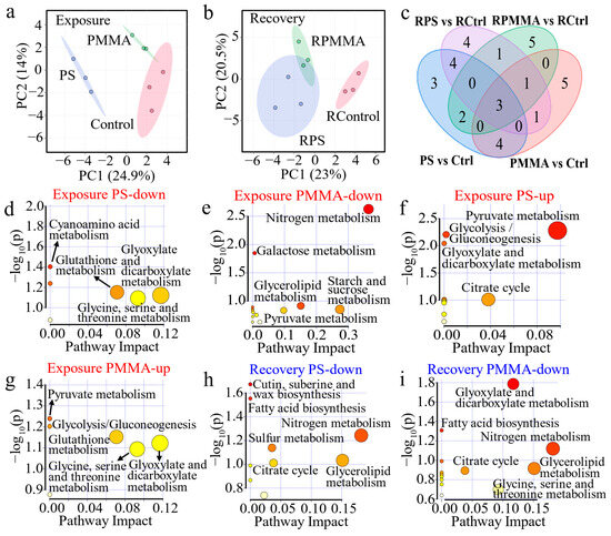 Metabolic analysis of algae at 96 h in the exposure and recovery periods. (a,b) PLS-DA of metabolites. (c) Veen map of DEMs. (d–i) Metabolic pathway perturbation. The color and size of the circles indicate the significance and degree of influence of the metabolic pathway, respectively. The darker the color and the larger the size of the circle, the greater the significance and influence of the metabolic pathway.