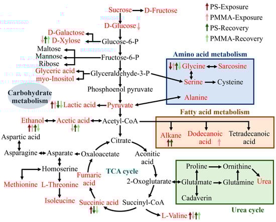 Overview of the phytotoxicity mechanisms of MPs studied by metabolic analysis. The red text denotes metabolites detected in this work. The upward- and downward-facing arrows indicate upregulated and downregulated metabolites, respectively (this figure is created based on the KEGG database and our previous study) [].