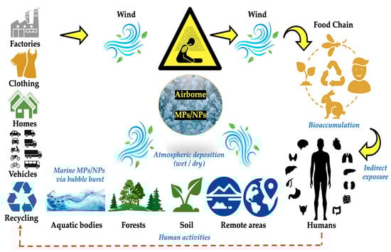 Airborne MPs/NPs are micro-nanoscopic particles that are becoming an increasing environmental issue due to their dimension and ability to migrate long distances on wind. Plant life and soil organisms may be affected by airborne MPs and NPs that land on terrestrial surfaces and build up in the soil. Weathering may cause them to further degrade over time, but their toughness and small size allow them to endure for extended periods of time. In a similar vein, these neo-pollutants can reach water bodies including rivers, lakes, and oceans by wind or rain [,,]. They can damage aquatic life and make their way into the food chain once they are in an aquatic environment. Wide-ranging effects on marine ecology may result from a rising load of edible plastics in the air. A vast variety of aquatic creatures, including zooplankton, small fish, and larger species like sea turtles, seabirds, and whales, can consume MPs once they are in the water. Blockages in the digestive tract, a false sense of fullness that results in malnutrition, and toxicity from absorbed chemicals are all consequences of consuming plastics, which can contain pollutants like heavy metals and polychlorinated biphenyls (PCBs). Biomagnification is the process by which toxic compounds build up in organisms and ascend the food chain to eventually reach humans [,]. Prey-sized MPs and NPs can harm marine species, and consuming them may have unknown biological repercussions. It is interesting to note that MPs/NPs in the atmosphere and those consumed by different marine species have a similar approximate size range, suggesting higher bioavailability. Once in the hydrosphere, indigestible MPs/NPs from air deposition would have detrimental ecological effects on marine life. Future ecological concerns will be exacerbated by the growing oceanic burden of airborne MPs/NPs [,]. A rational risk assessment is facilitated by knowledge about origins of the MPs/NPs, distribution, and mode of transportation.