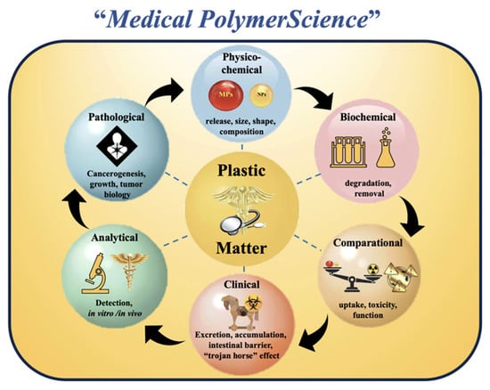 New multidisciplinary technologies (communication, social, environmental, health, scientific, etc.) that can promote sustainable development, resource conservation, and environmental sustainability must be put into place. More importantly, though, they must effectively address the issue of plastic materials. Because the presence of MPs/NPs involves a number of scientific branches, it is essential that scientists and other interested parties from a range of scientific disciplines conduct thorough and standardized research that can elucidate the interactions of airborne MPs/NPs with humans and the environment, as well as their potential pathogenic processes [,,]. One example of this new type of interdisciplinary research collaboration is the recently established field of Medical Polymer Science (MPS). This novel scientific approach to MP/NP pollution is diagrammed in Figure 9.